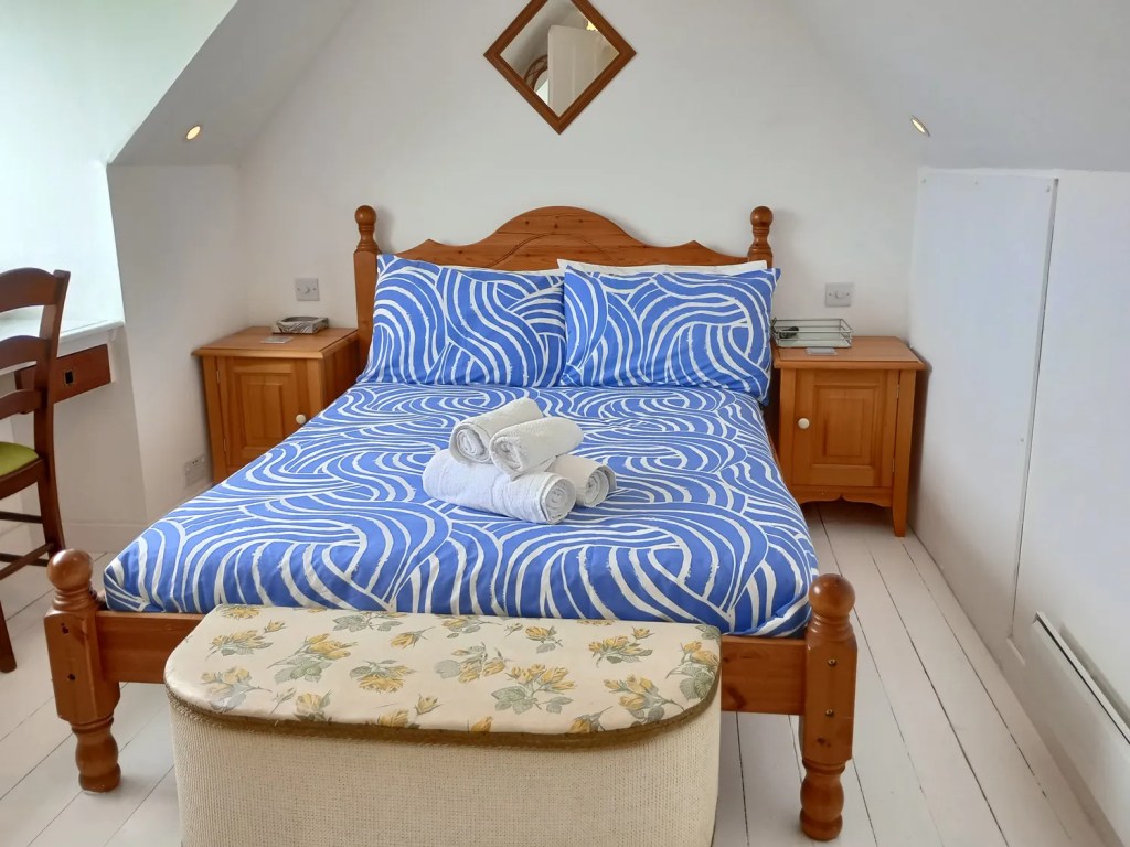 There is a double bed with bedside cabinets and a chest of drawers. There is a blanket-box containing spare bedding and a free-standing hanging rail. A wide window ledge has been built to provide a laptop desk and chair with a great view.