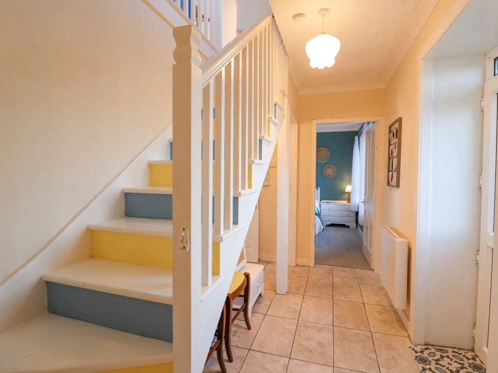 The house sleeps 6. There is an entrance porch and cloakroom. There are three bedrooms (one en-suite), a kitchen, a sitting/dining room, a family bathroom and a landing with a daybed for taking in the panoramic views. The hallway has open storage and access to the secure walled front garden with sea views. There is a larger grassed area to the back, suitable for kicking a ball around. There is an area of decking with chairs. Pets are welcome